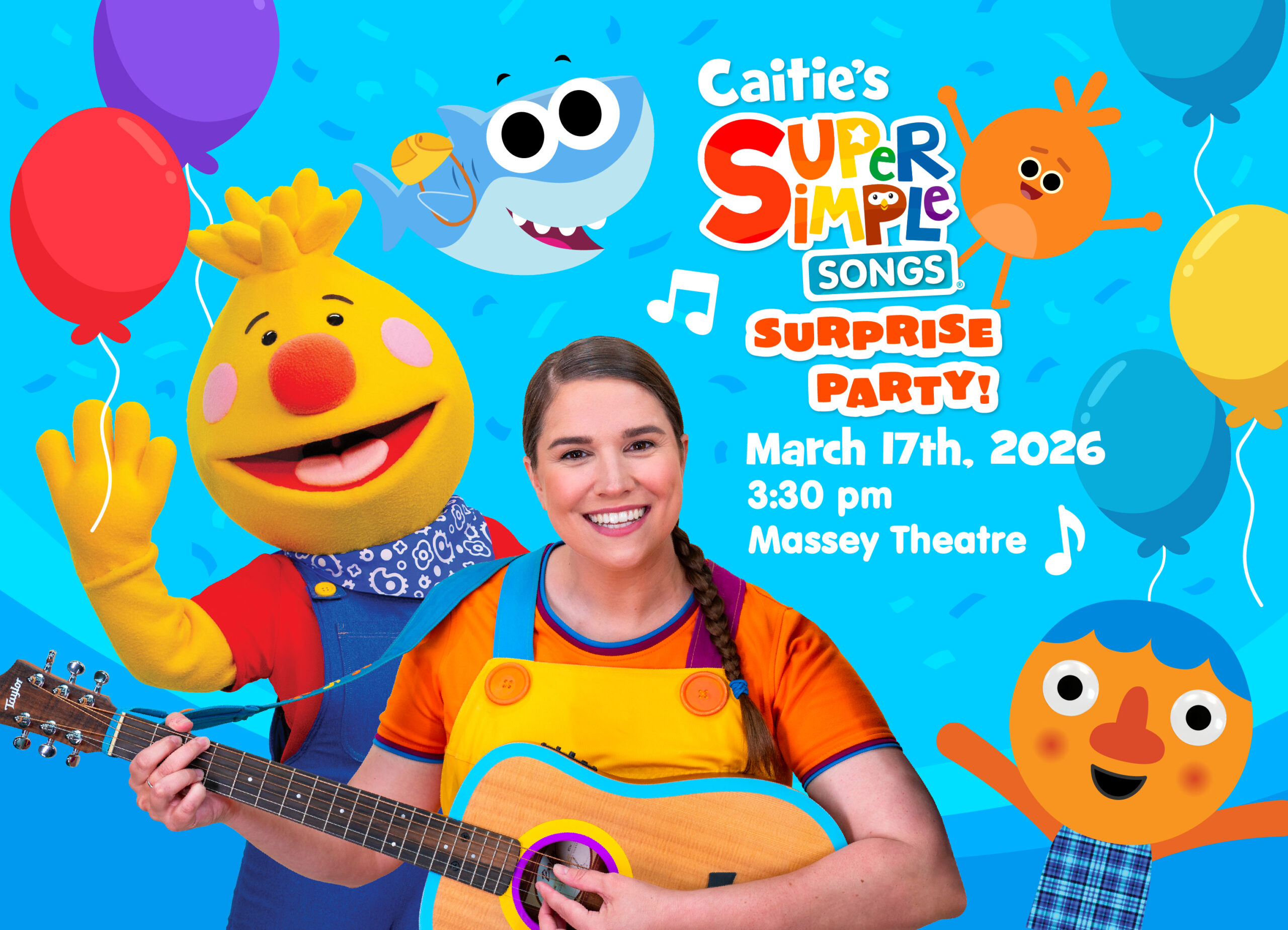 Get ready for a 90-minute interactive musical adventure with Caitie and your favourite friends from Super Simple Songs including The Bumble Nums, Finny the Shark, Noodle & Pals, and of course, Tobee!