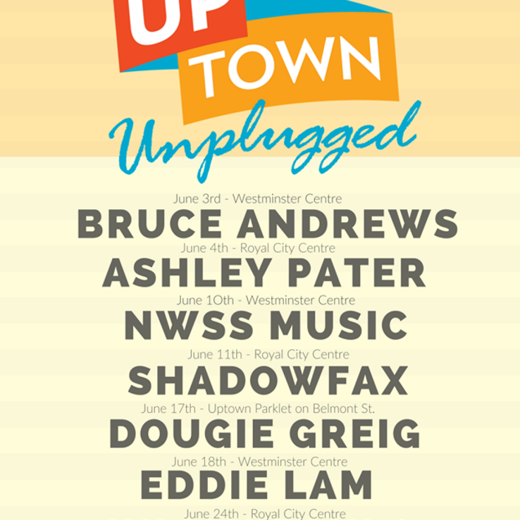 Uptown Unplugged is a weekly performing arts series we present in partnership with the Arts Council of New Westminster. Performances take place in various locations throughout Uptown on Saturdays and Sundays from noon to 2pm from June 3 until September 10, 2017.
